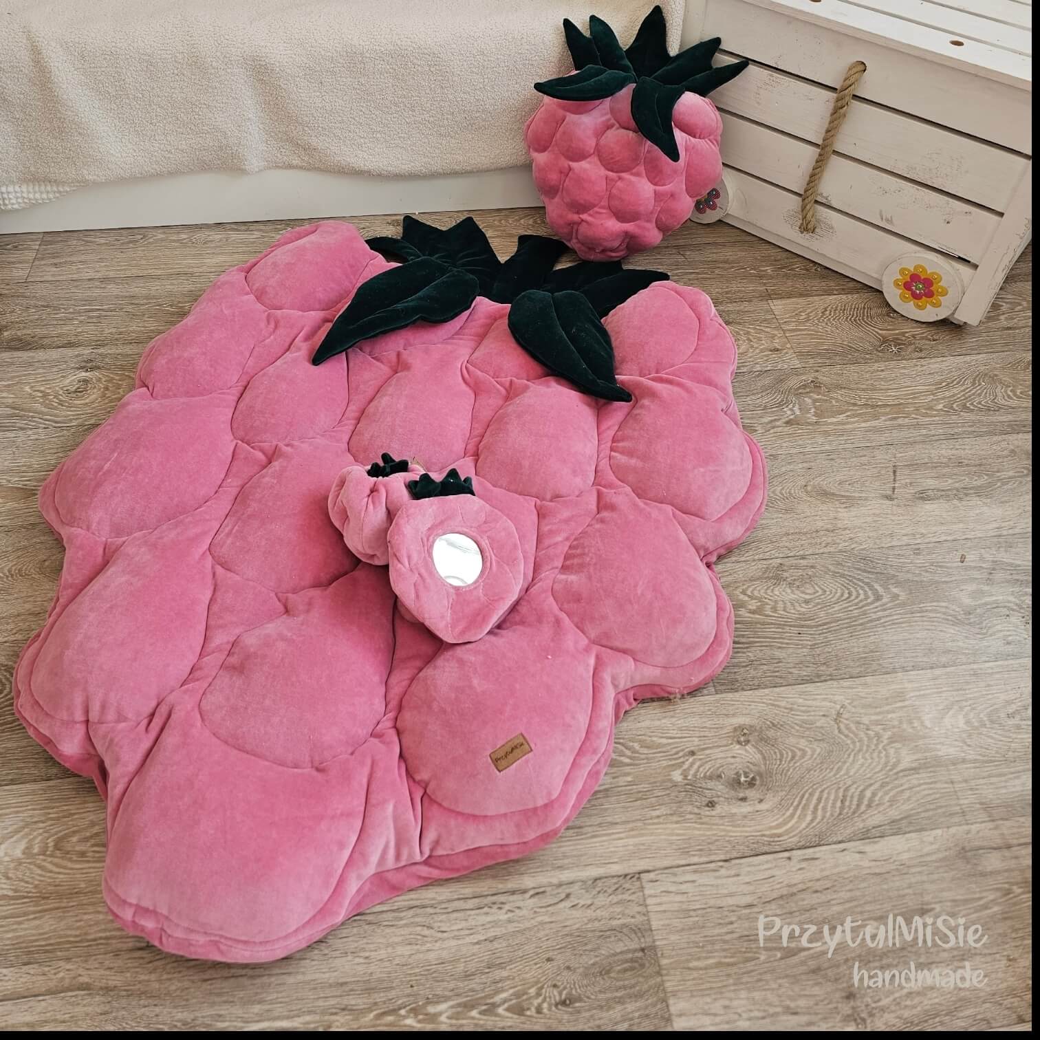 Mata welurowa malinka to produkt, który ze względu na użyte do produkcji materiały może towarzyszyć dziecku od pierwszych dni życia. Jest delikatna i ciepła, a piękny i intensywny kolor przyciąga wzrok każdego dziecka. Mata uszyta jest na antyalergicznym mięciutkim wypełnieniu. Powstałe dzięki przeszyciom wypustki dopasowują się do ciała dziecka, do tego stymulują i zachęcają do zabaw, głaskania i tulenia. Dodatkowym elementem który z całą pewnością umili czas zabaw są szeleszczące listki malinki .