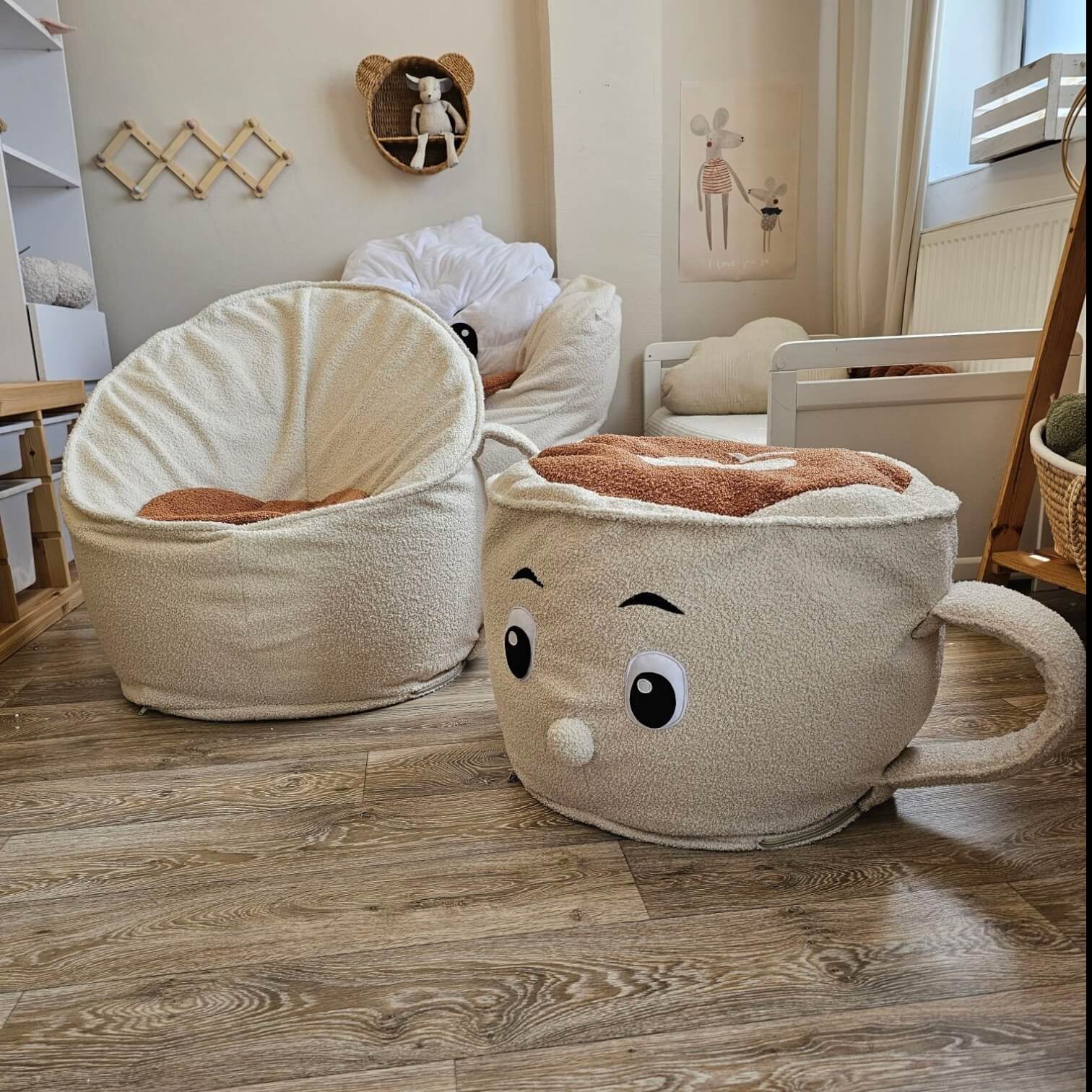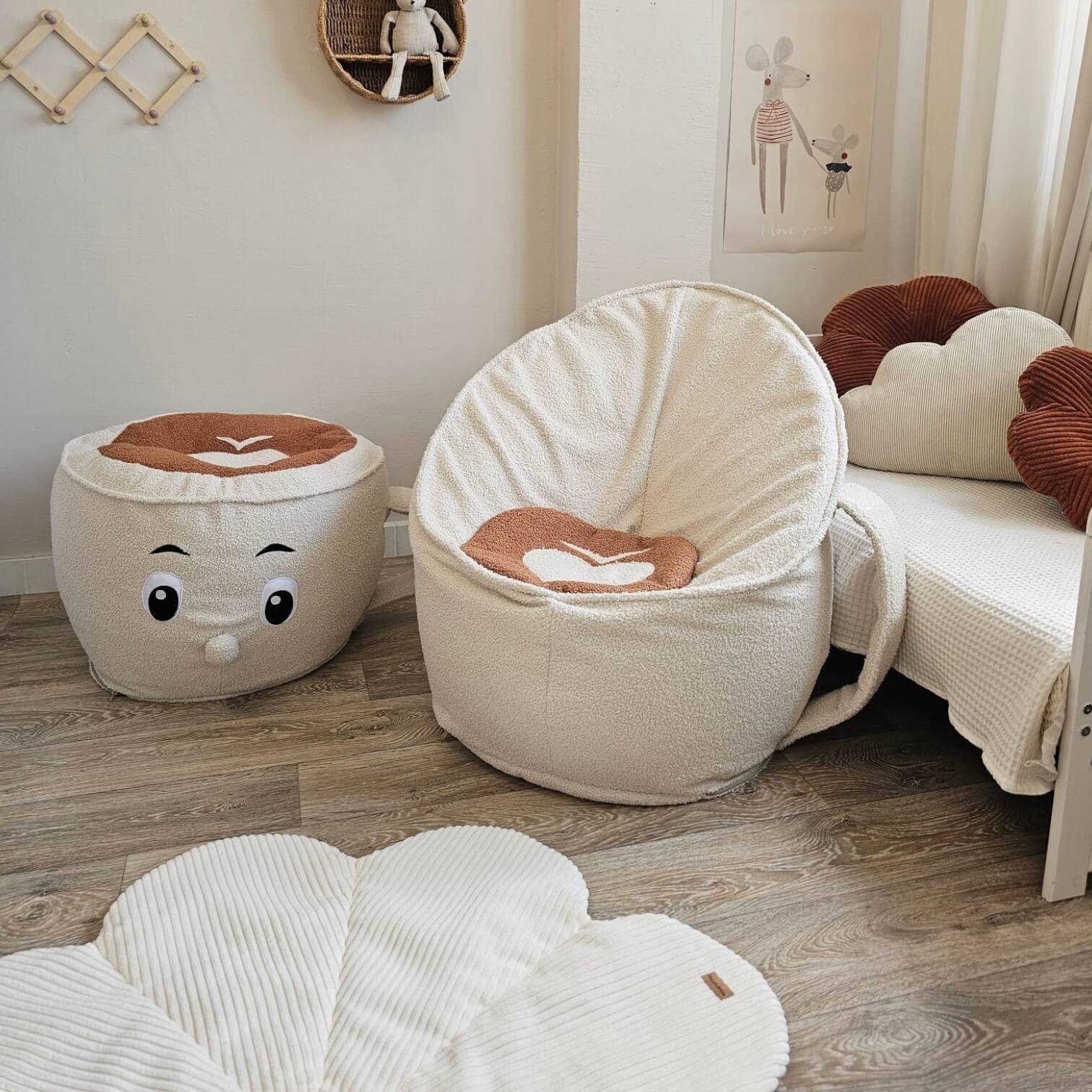 Pufy z kolekcji tworzą nieodparty duet, gdy są ze sobą stylizowane – mniejszy puf bez problemu wpasowuje się obok większego, tworząc zabawną i relaksującą przestrzeń, która zachwyca dzieci i dorosłych.