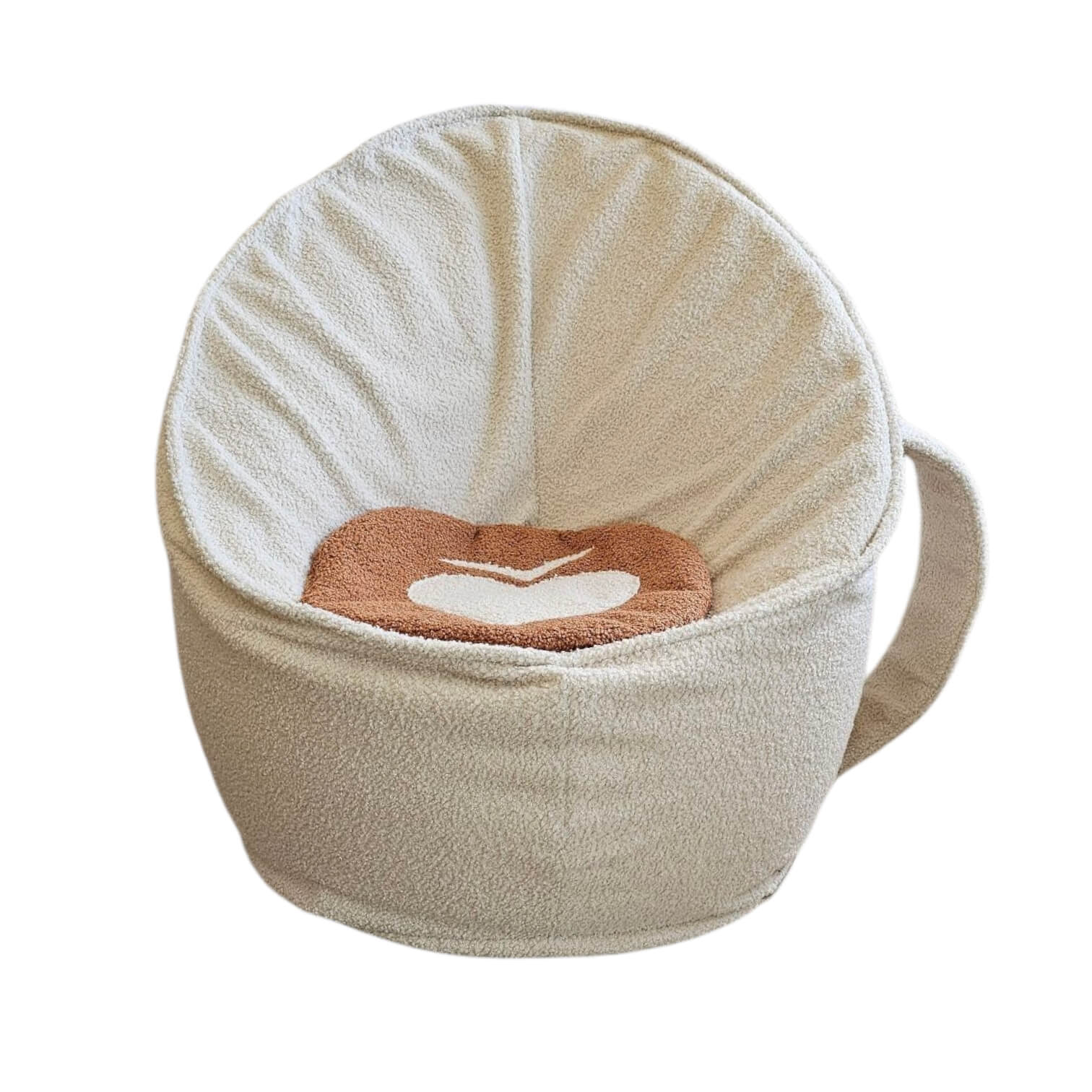 Posiada blat inspirowany latte z motywem pianki w kształcie serca i otwartą część do siedzenia w stylu kubka..